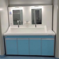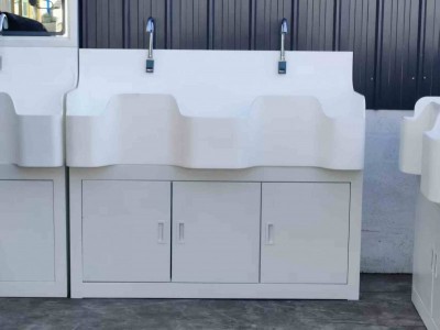 高分子洗手池材质特点:采用高分子材料一次吸塑成型,出水方式有:感应式、膝控式、脚踏式和手动开关,一台洗手池可客户要求选择单一出水方式或多种出水方式。洗手池分高背和低背,高背总高度1800mm,配有美容镜,照明灯,皂液器,可按客户要求配置烘手器和热水器。低背板无配置。
