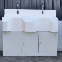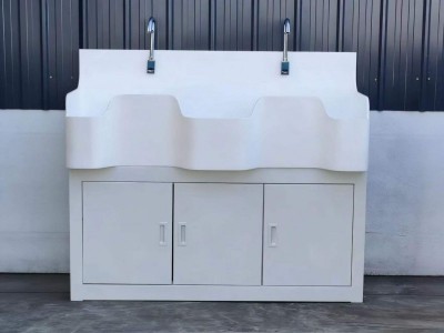 高分子洗手池材质特点:采用高分子材料一次吸塑成型,出水方式有:感应式、膝控式、脚踏式和手动开关,一台洗手池可客户要求选择单一出水方式或多种出水方式。洗手池分高背和低背,高背总高度1800mm,配有美容镜,照明灯,皂液器,可按客户要求配置烘手器和热水器。低背板无配置。